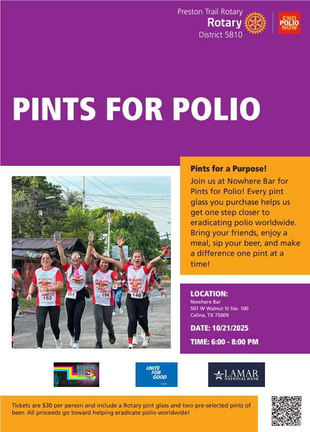 With your help, we can end polio for good through three simple actions: Learn. Share. Donate. Join the Preston Trail Rotary Club and the Rotary E-Club of North Texas for Pints for Polio on October 21st from 6–8 PM at Nowhere Bar.